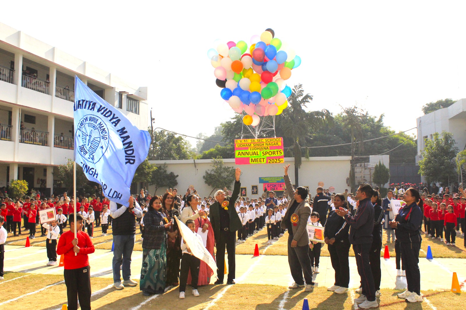 The campus of BVM Udham Singh Nagar transformed into a carnival of colour, cheer and amazing wonder as the Annual Athletic Meet 2025 (Junior Wing) unfolded on 29th November with breathtaking splendour. The morning began with the graceful Tilak Ceremony and a warm welcome of the esteemed members of BVM Trust Sh. Parkash Chand Goyal ji(Secretary) and CA Rajiv Puri ji(Joint Secretary) , followed by the divine glow of Deep Prajwalan ceremony casting an aura of sanctity over the celebration. A captivating Welcome Dance lit up the stage , paving the way for the proud Flag Hoisting, impressive March Past by tiny champs, radiant Torch Lighting by all the dignitaries, dignified Oath ceremony by Dhruvika (UKG ), Secretary Sir declaring the Athletic Meet officially open and colourful balloons ascending like dreams into the sky.