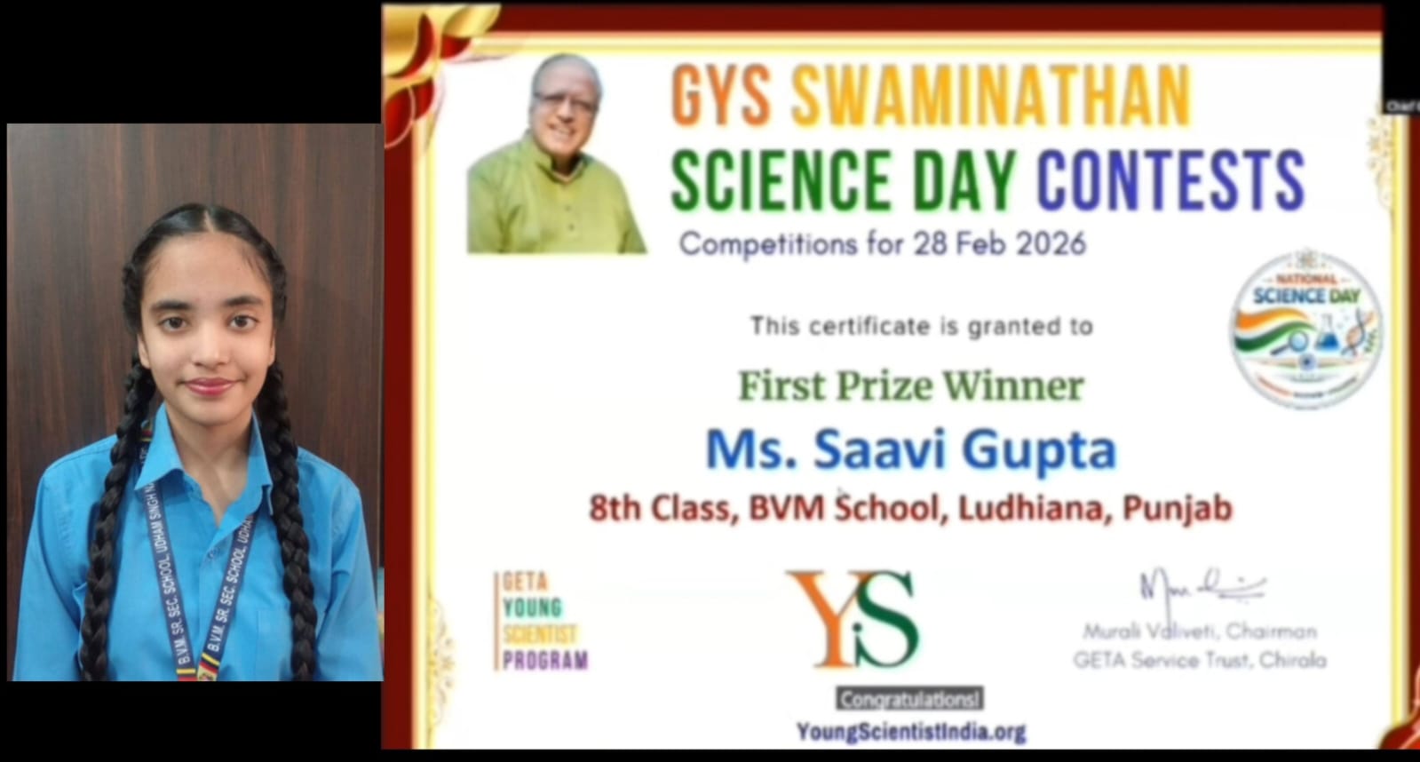 The competition was organized by the GETA Young Scientist India Organisation under the distinguished platform of the GYS Swaminathan Science Day Contests (SSDC 2026).